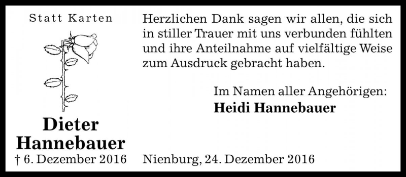 Hier finden Sie alle Traueranzeigen aus der Zeitung, die bisher für Dieter Hannebauer erschienen sind. Weitere Traueranzeigen, die in der Zeitung erscheinen, werden hier ebenfalls aufgelistet