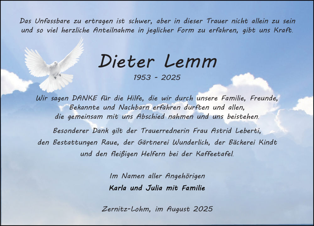 Hier finden Sie alle Traueranzeigen aus der Zeitung, die bisher für Dieter Lemm erschienen sind. Weitere Traueranzeigen, die in der Zeitung erscheinen, werden hier ebenfalls aufgelistet