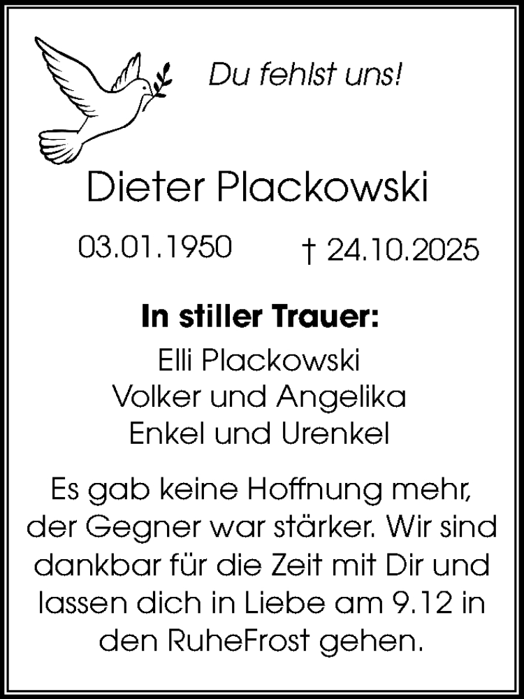 Hier finden Sie alle Traueranzeigen aus der Zeitung, die bisher für Dieter Plackowski erschienen sind. Weitere Traueranzeigen, die in der Zeitung erscheinen, werden hier ebenfalls aufgelistet