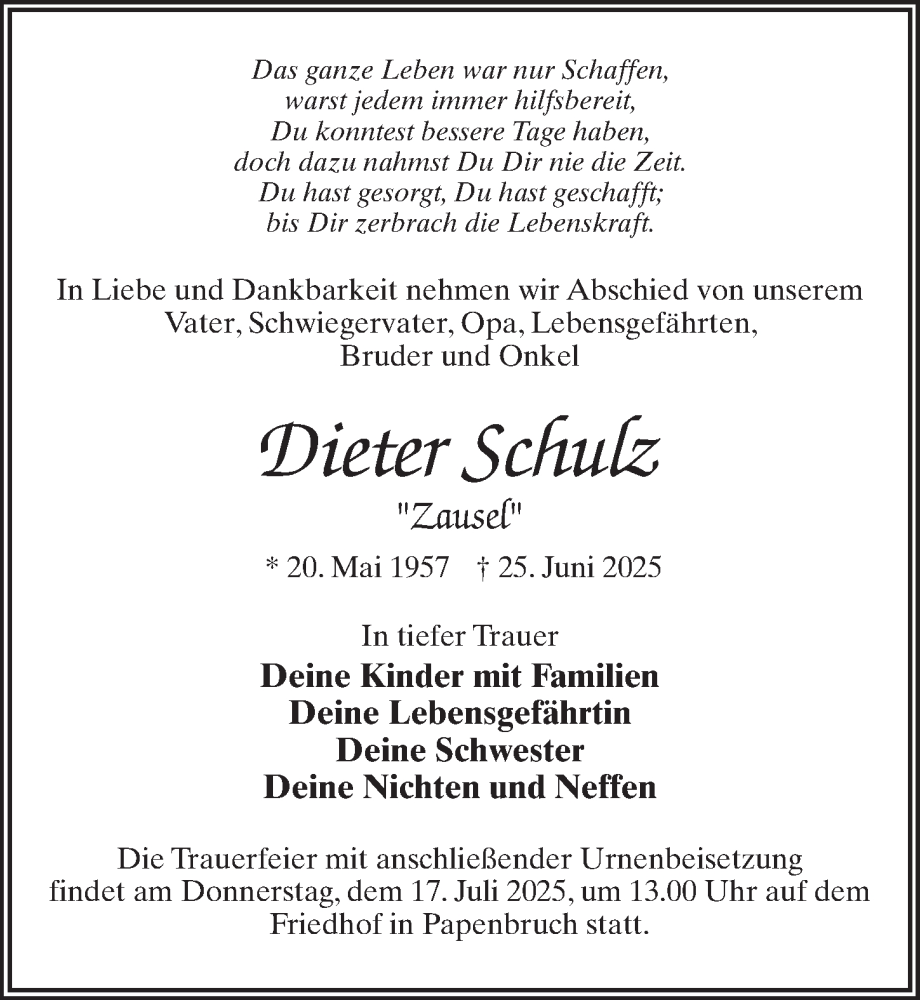 Hier finden Sie alle Traueranzeigen aus der Zeitung, die bisher für Dieter Schulz erschienen sind. Weitere Traueranzeigen, die in der Zeitung erscheinen, werden hier ebenfalls aufgelistet