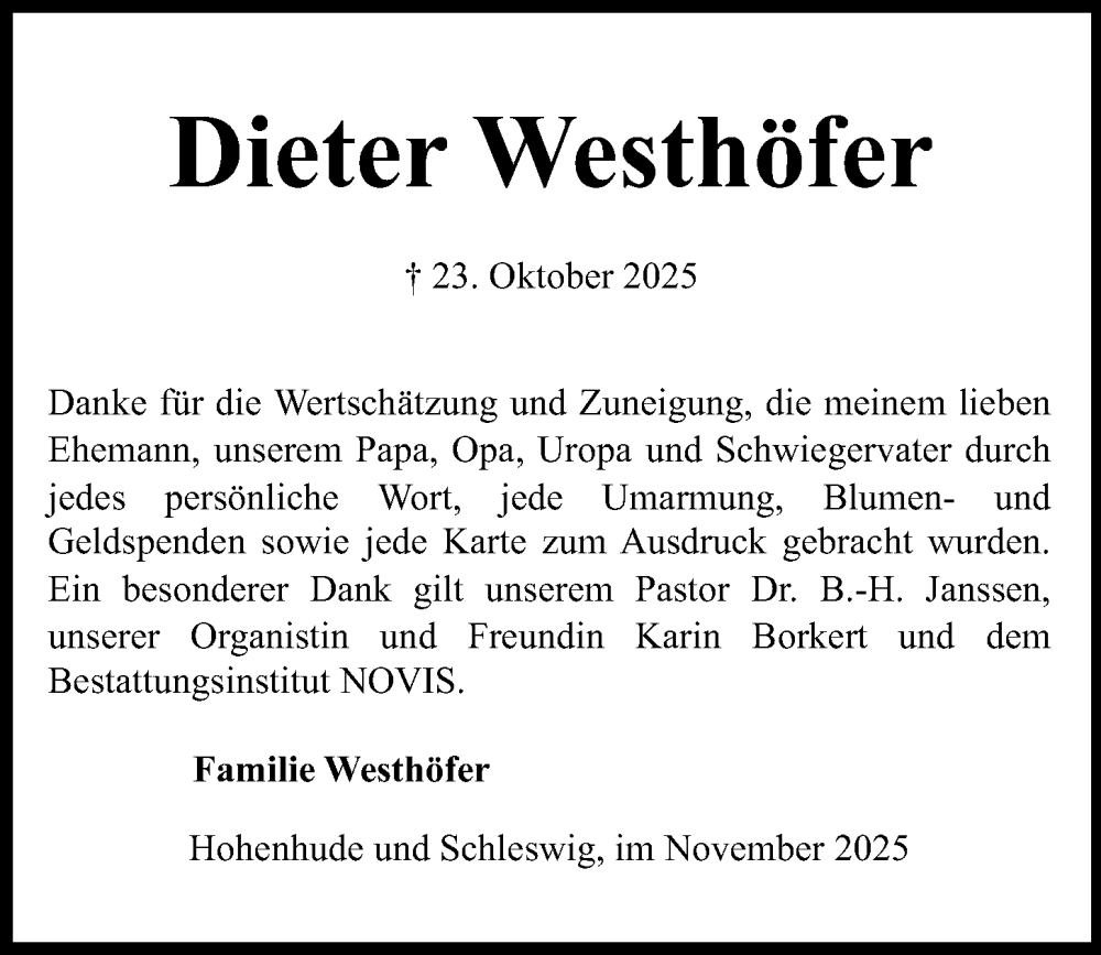 Hier finden Sie alle Traueranzeigen aus der Zeitung, die bisher für Dieter Westhöfer erschienen sind. Weitere Traueranzeigen, die in der Zeitung erscheinen, werden hier ebenfalls aufgelistet