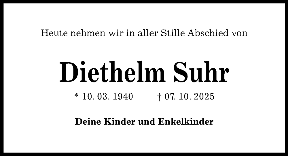 Hier finden Sie alle Traueranzeigen aus der Zeitung, die bisher für Diethelm Suhr erschienen sind. Weitere Traueranzeigen, die in der Zeitung erscheinen, werden hier ebenfalls aufgelistet