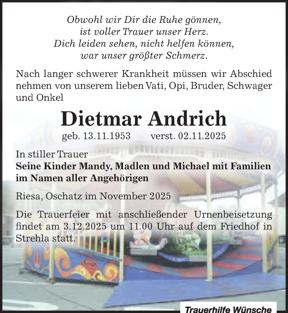 Hier finden Sie alle Traueranzeigen aus der Zeitung, die bisher für Dietmar Andrich erschienen sind. Weitere Traueranzeigen, die in der Zeitung erscheinen, werden hier ebenfalls aufgelistet