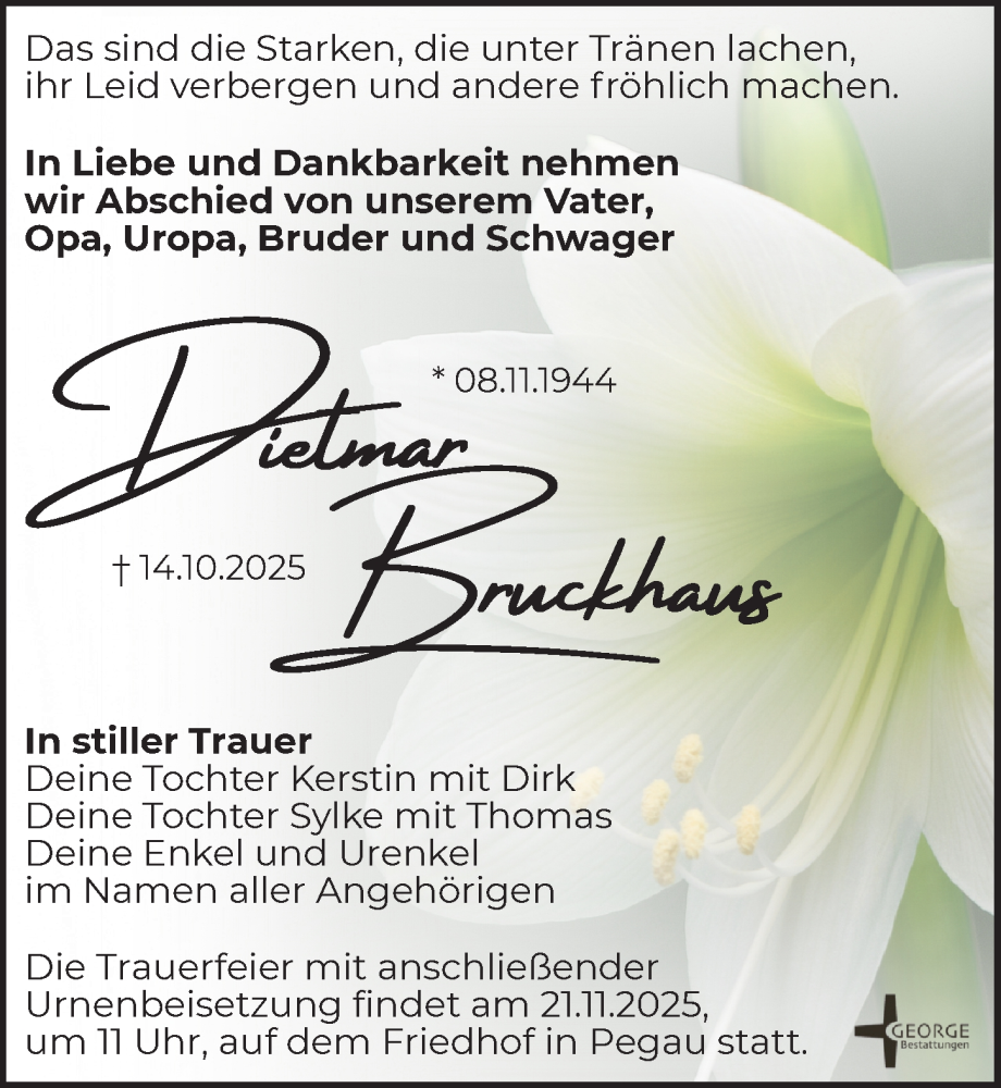 Hier finden Sie alle Traueranzeigen aus der Zeitung, die bisher für Dietmar Bruckhaus erschienen sind. Weitere Traueranzeigen, die in der Zeitung erscheinen, werden hier ebenfalls aufgelistet
