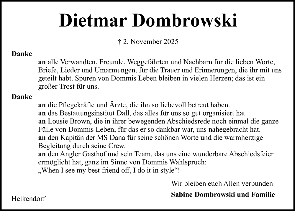 Hier finden Sie alle Traueranzeigen aus der Zeitung, die bisher für Dietmar Dombrowski erschienen sind. Weitere Traueranzeigen, die in der Zeitung erscheinen, werden hier ebenfalls aufgelistet