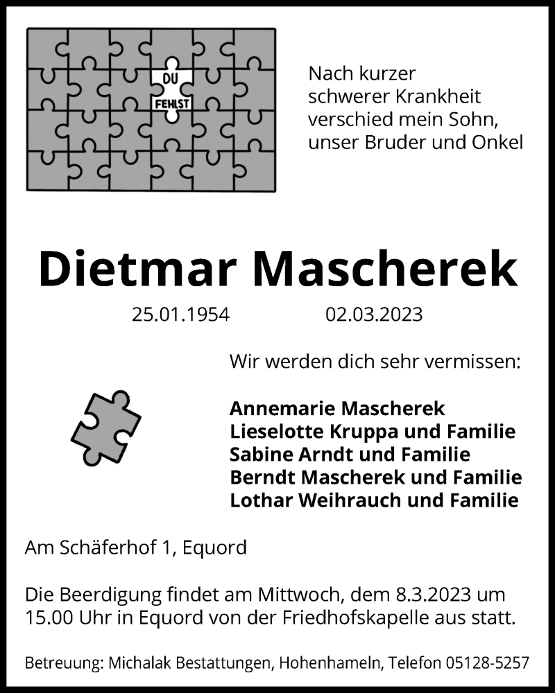 Hier finden Sie alle Traueranzeigen aus der Zeitung, die bisher für Dietmar Mascherek erschienen sind. Weitere Traueranzeigen, die in der Zeitung erscheinen, werden hier ebenfalls aufgelistet