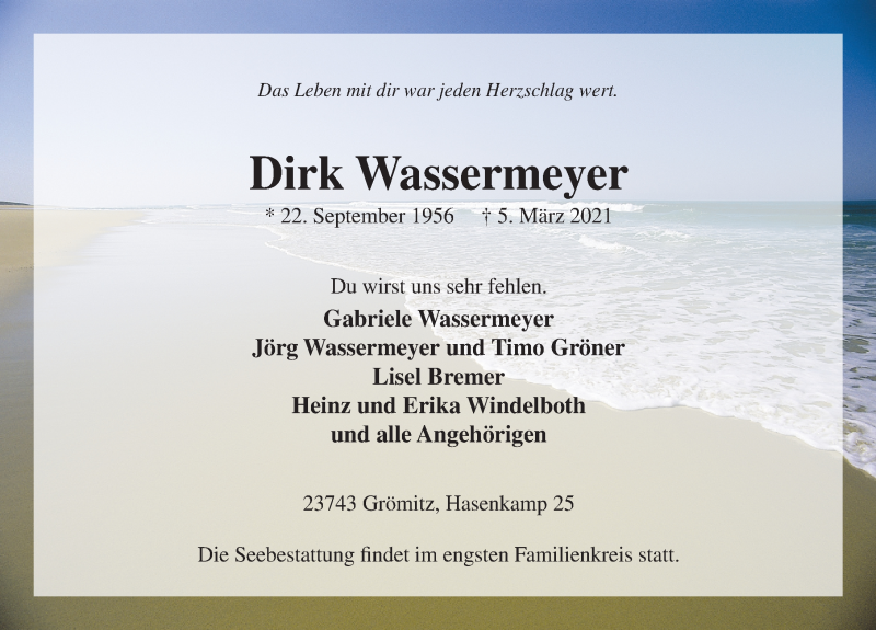 Hier finden Sie alle Traueranzeigen aus der Zeitung, die bisher für Dirk Wassermeyer erschienen sind. Weitere Traueranzeigen, die in der Zeitung erscheinen, werden hier ebenfalls aufgelistet
