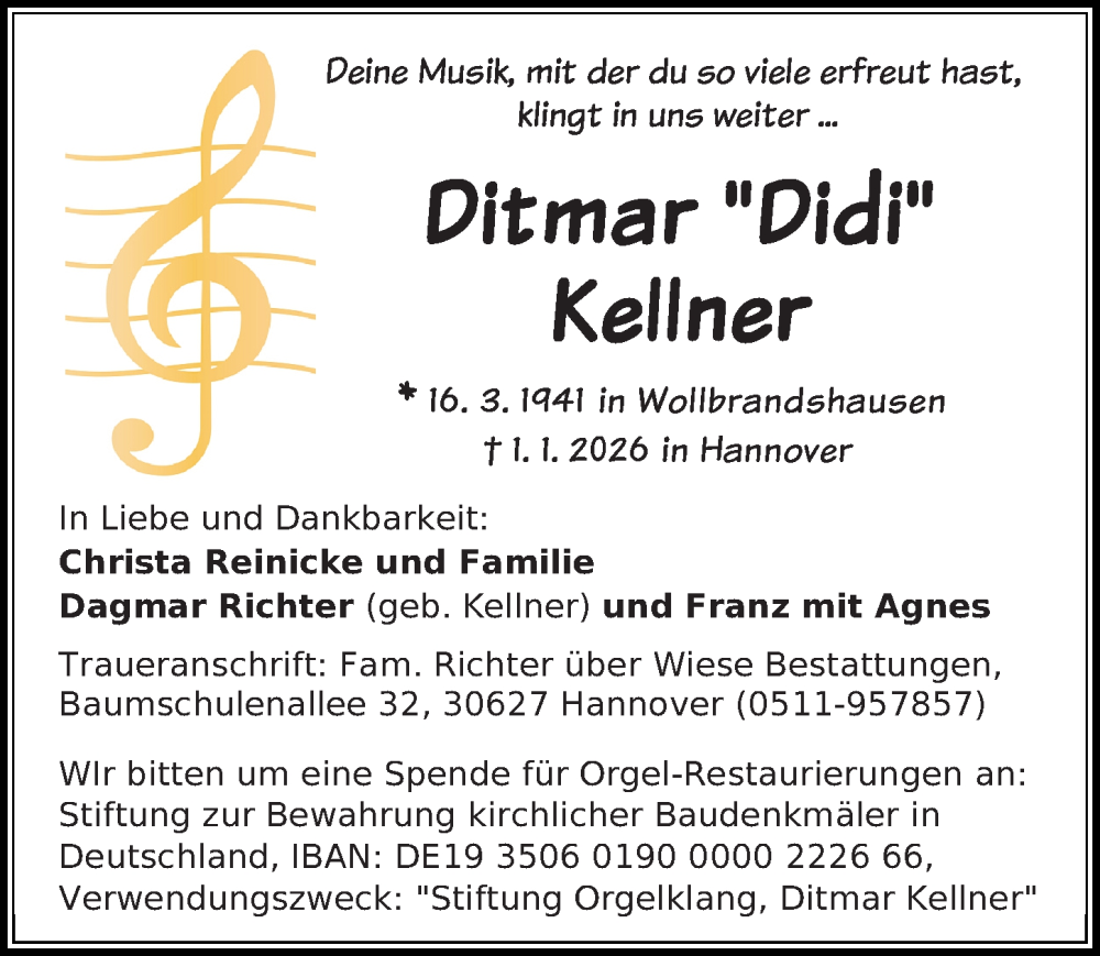 Hier finden Sie alle Traueranzeigen aus der Zeitung, die bisher für Ditmar Kellner erschienen sind. Weitere Traueranzeigen, die in der Zeitung erscheinen, werden hier ebenfalls aufgelistet
