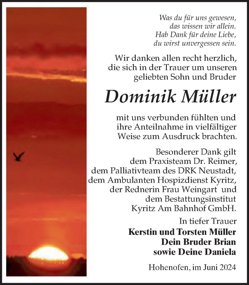 Hier finden Sie alle Traueranzeigen aus der Zeitung, die bisher für Dominik Müller erschienen sind. Weitere Traueranzeigen, die in der Zeitung erscheinen, werden hier ebenfalls aufgelistet