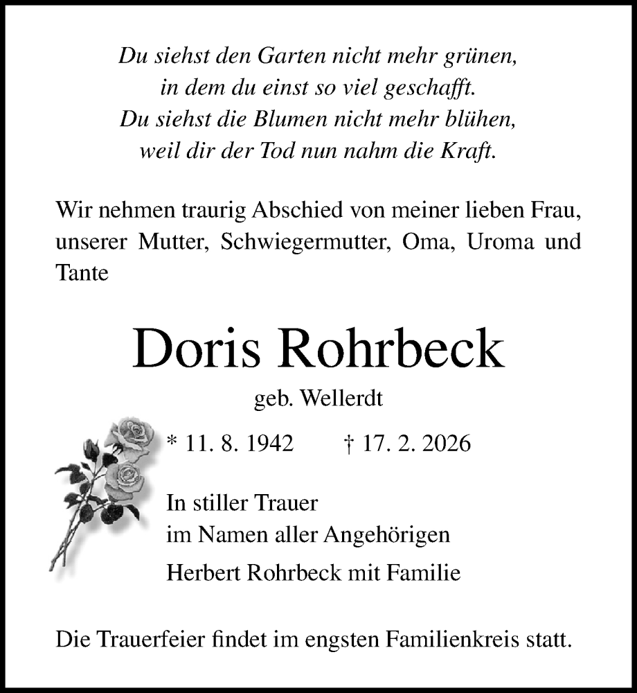 Hier finden Sie alle Traueranzeigen aus der Zeitung, die bisher für Doris Rohrbeck erschienen sind. Weitere Traueranzeigen, die in der Zeitung erscheinen, werden hier ebenfalls aufgelistet