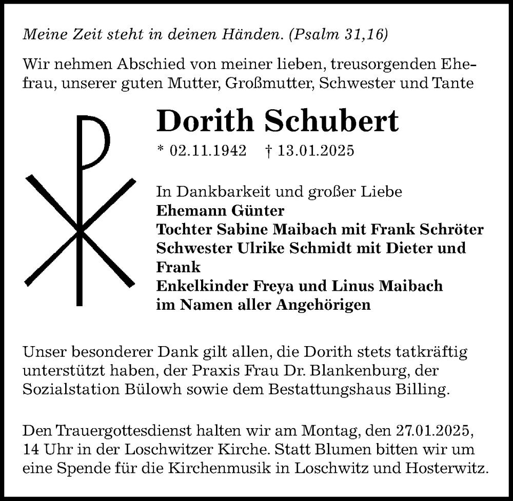 Hier finden Sie alle Traueranzeigen aus der Zeitung, die bisher für Dorith Schubert erschienen sind. Weitere Traueranzeigen, die in der Zeitung erscheinen, werden hier ebenfalls aufgelistet