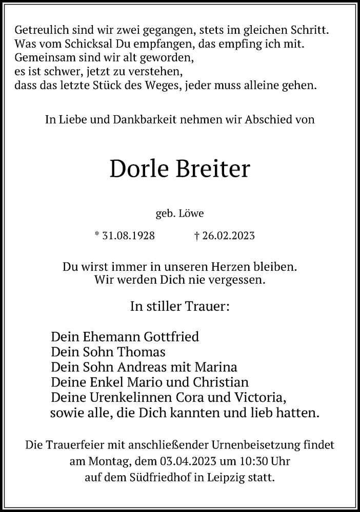Hier finden Sie alle Traueranzeigen aus der Zeitung, die bisher für Dorle Breiter erschienen sind. Weitere Traueranzeigen, die in der Zeitung erscheinen, werden hier ebenfalls aufgelistet