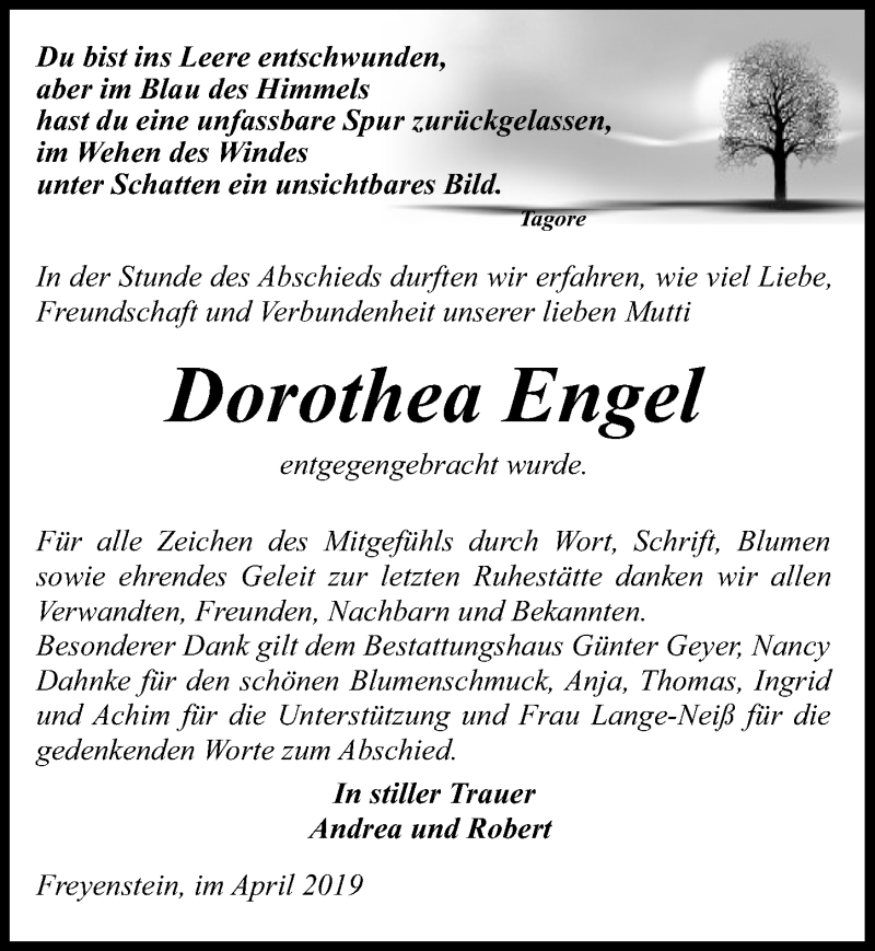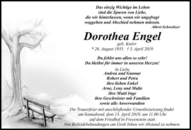 Hier finden Sie alle Traueranzeigen aus der Zeitung, die bisher für Dorothea Engel erschienen sind. Weitere Traueranzeigen, die in der Zeitung erscheinen, werden hier ebenfalls aufgelistet