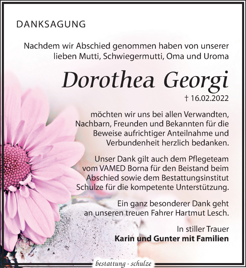 Hier finden Sie alle Traueranzeigen aus der Zeitung, die bisher für Dorothea Georgi erschienen sind. Weitere Traueranzeigen, die in der Zeitung erscheinen, werden hier ebenfalls aufgelistet
