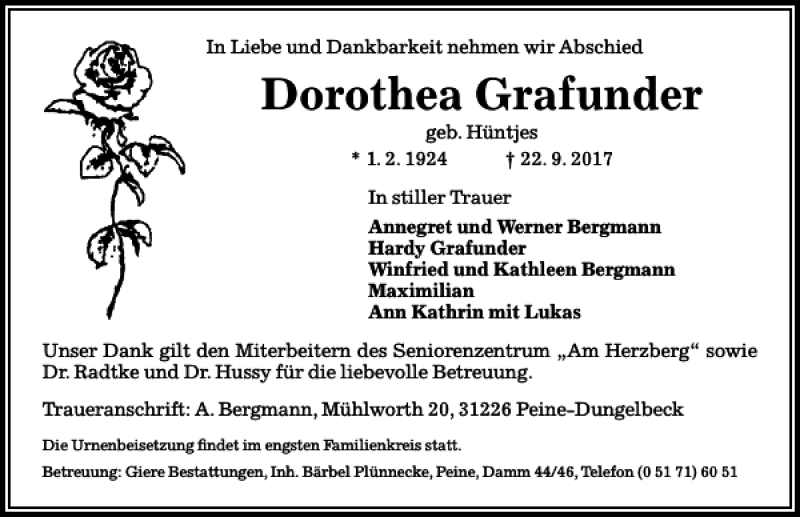 Hier finden Sie alle Traueranzeigen aus der Zeitung, die bisher für Dorothea Grafunder erschienen sind. Weitere Traueranzeigen, die in der Zeitung erscheinen, werden hier ebenfalls aufgelistet
