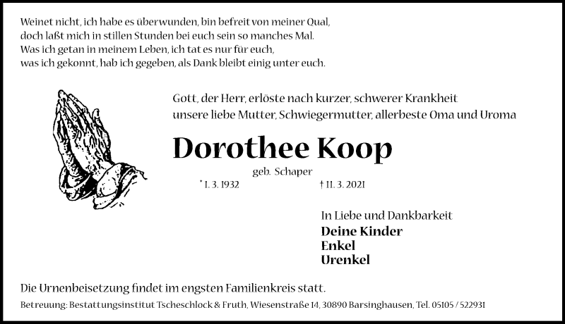 Hier finden Sie alle Traueranzeigen aus der Zeitung, die bisher für Dorothee Koop erschienen sind. Weitere Traueranzeigen, die in der Zeitung erscheinen, werden hier ebenfalls aufgelistet