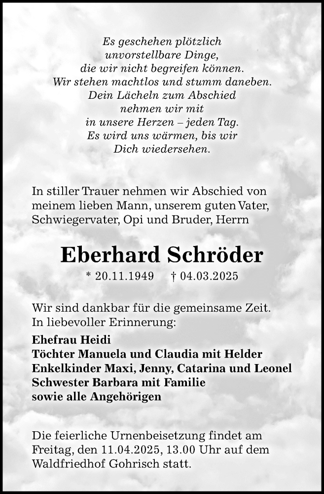 Hier finden Sie alle Traueranzeigen aus der Zeitung, die bisher für Eberhard Schröder erschienen sind. Weitere Traueranzeigen, die in der Zeitung erscheinen, werden hier ebenfalls aufgelistet