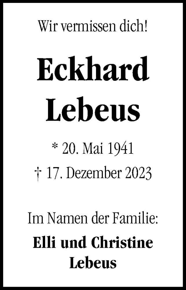 Hier finden Sie alle Traueranzeigen aus der Zeitung, die bisher für Eckhard Lebeus erschienen sind. Weitere Traueranzeigen, die in der Zeitung erscheinen, werden hier ebenfalls aufgelistet