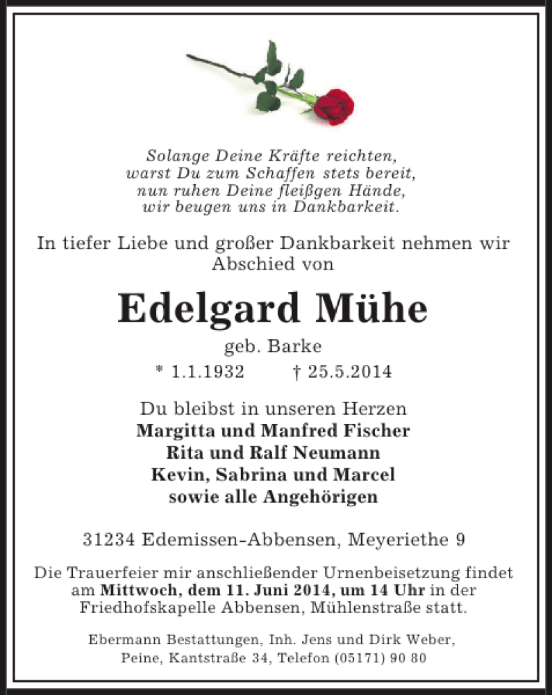 Hier finden Sie alle Traueranzeigen aus der Zeitung, die bisher für Edelgard Mühe erschienen sind. Weitere Traueranzeigen, die in der Zeitung erscheinen, werden hier ebenfalls aufgelistet