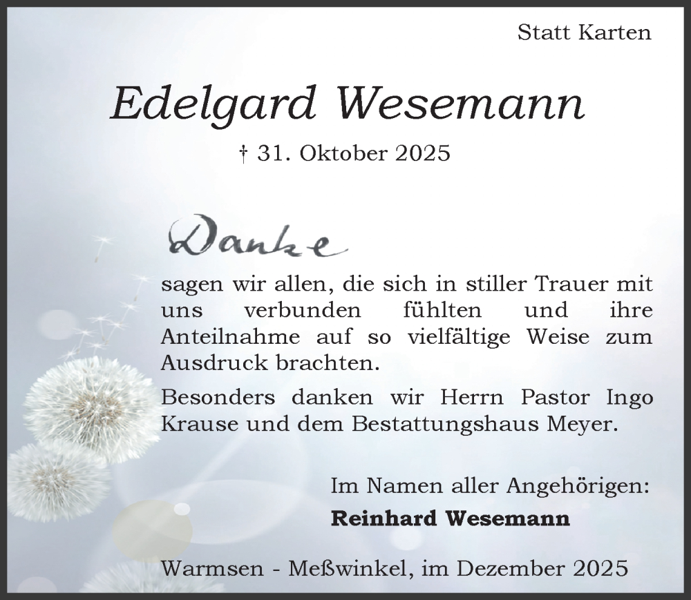 Hier finden Sie alle Traueranzeigen aus der Zeitung, die bisher für Edelgard Wesemann erschienen sind. Weitere Traueranzeigen, die in der Zeitung erscheinen, werden hier ebenfalls aufgelistet