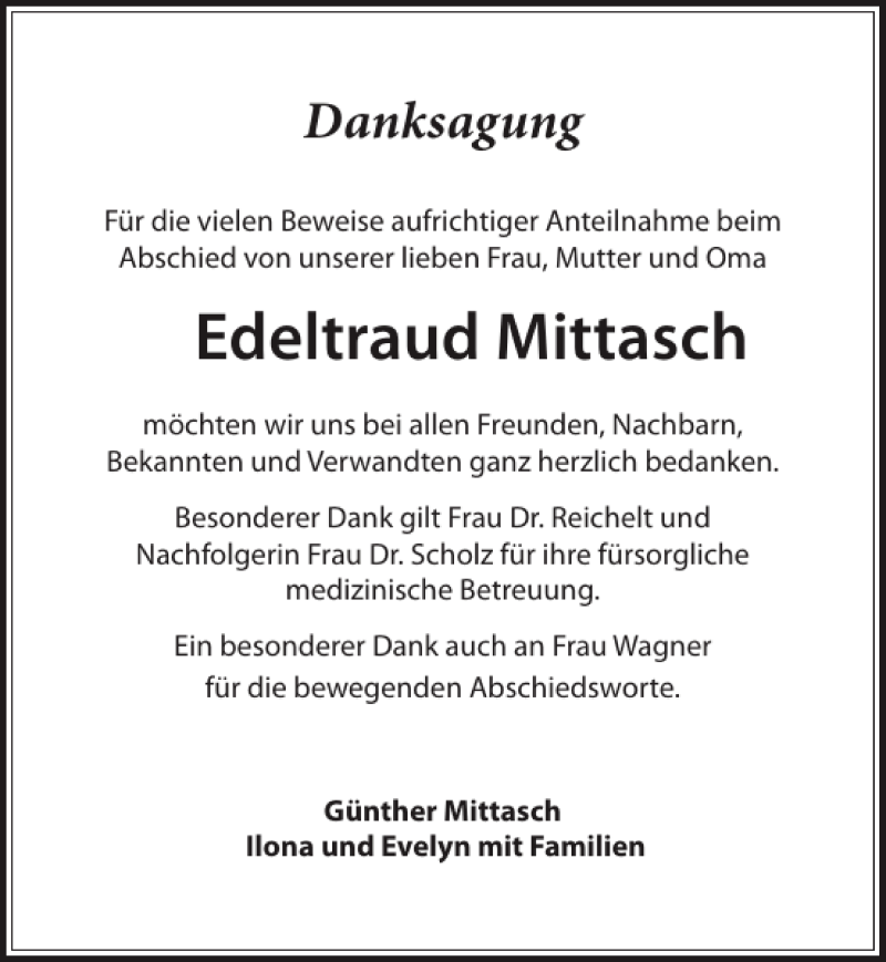 Hier finden Sie alle Traueranzeigen aus der Zeitung, die bisher für Edeltraud Mittasch erschienen sind. Weitere Traueranzeigen, die in der Zeitung erscheinen, werden hier ebenfalls aufgelistet