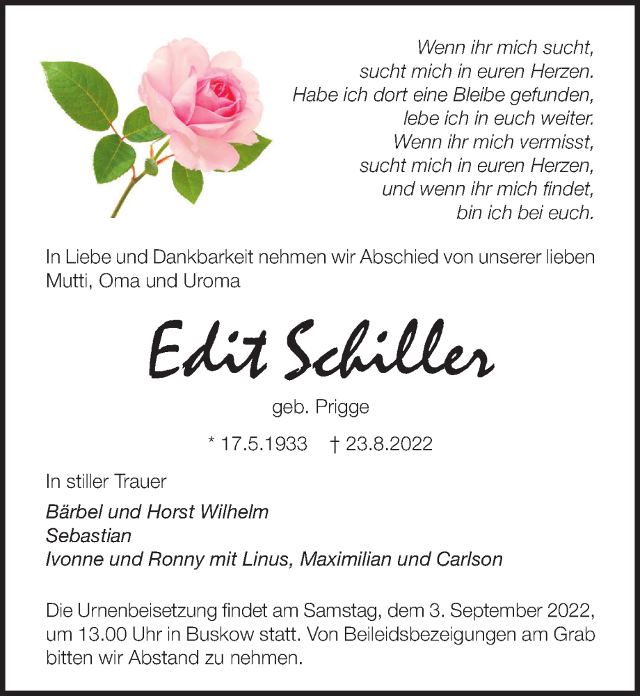 Hier finden Sie alle Traueranzeigen aus der Zeitung, die bisher für Edit Schiller erschienen sind. Weitere Traueranzeigen, die in der Zeitung erscheinen, werden hier ebenfalls aufgelistet