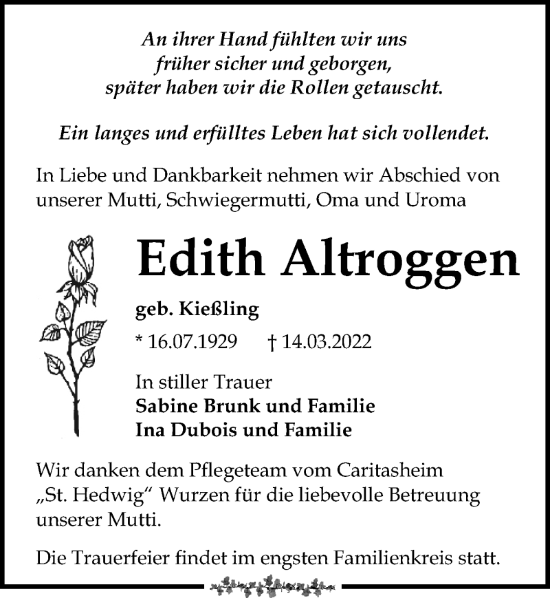Hier finden Sie alle Traueranzeigen aus der Zeitung, die bisher für Edith Altroggen erschienen sind. Weitere Traueranzeigen, die in der Zeitung erscheinen, werden hier ebenfalls aufgelistet
