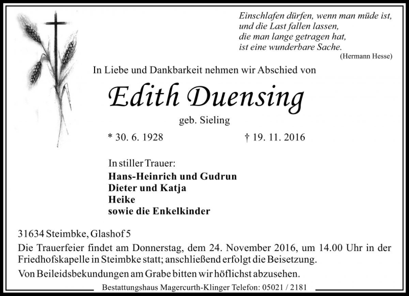 Hier finden Sie alle Traueranzeigen aus der Zeitung, die bisher für Edith Duensing erschienen sind. Weitere Traueranzeigen, die in der Zeitung erscheinen, werden hier ebenfalls aufgelistet