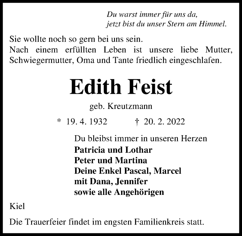 Hier finden Sie alle Traueranzeigen aus der Zeitung, die bisher für Edith Feist erschienen sind. Weitere Traueranzeigen, die in der Zeitung erscheinen, werden hier ebenfalls aufgelistet