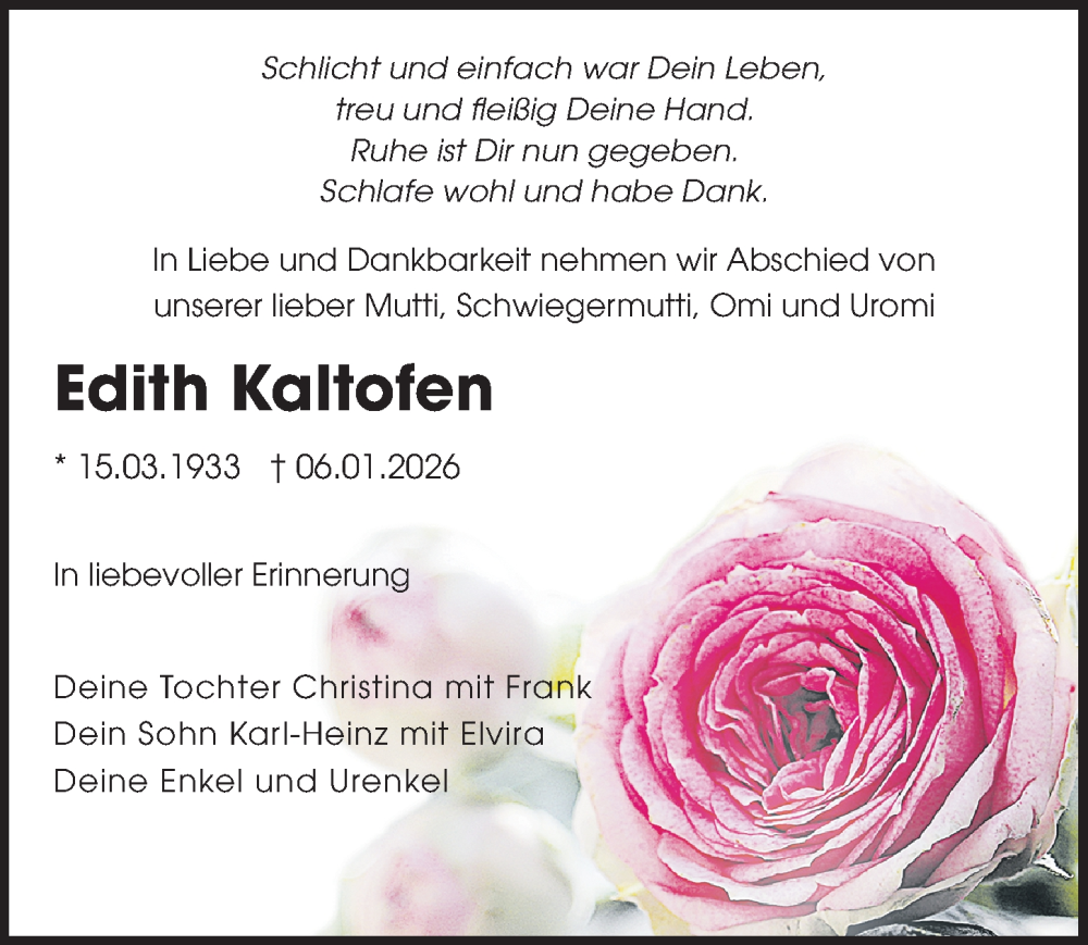 Hier finden Sie alle Traueranzeigen aus der Zeitung, die bisher für Edith Kaltofen erschienen sind. Weitere Traueranzeigen, die in der Zeitung erscheinen, werden hier ebenfalls aufgelistet