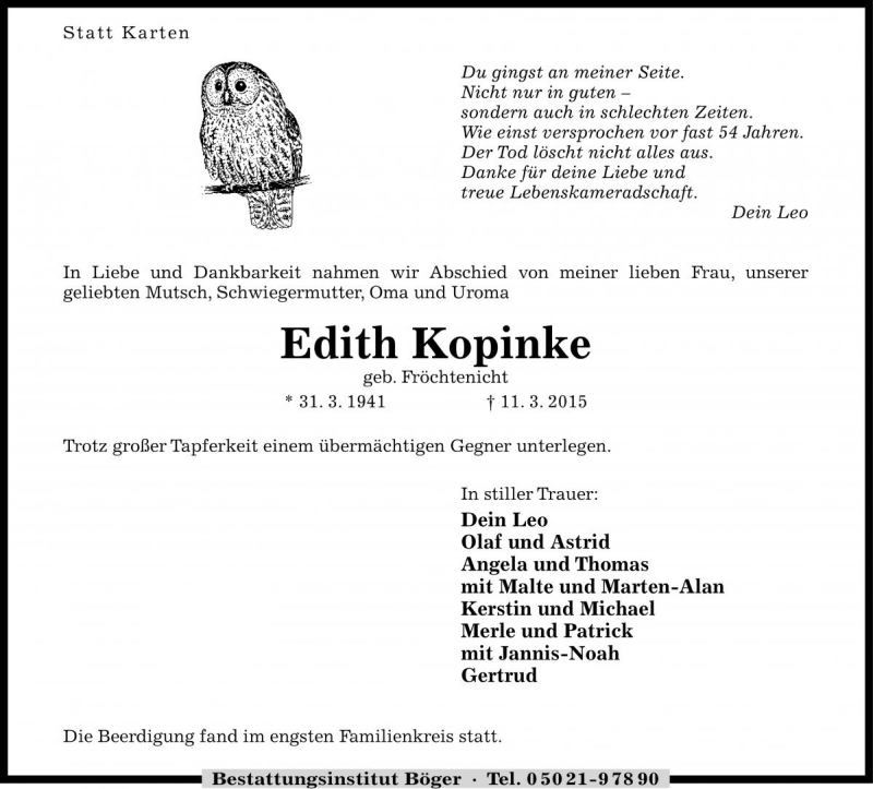 Hier finden Sie alle Traueranzeigen aus der Zeitung, die bisher für Edith Kopinke erschienen sind. Weitere Traueranzeigen, die in der Zeitung erscheinen, werden hier ebenfalls aufgelistet