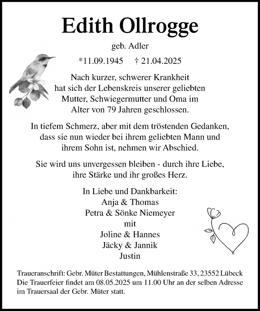 Hier finden Sie alle Traueranzeigen aus der Zeitung, die bisher für Edith Ollrogge erschienen sind. Weitere Traueranzeigen, die in der Zeitung erscheinen, werden hier ebenfalls aufgelistet