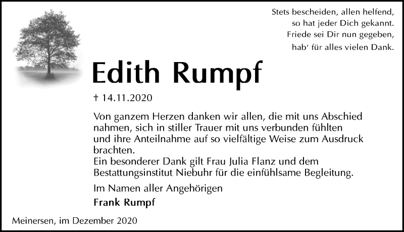 Hier finden Sie alle Traueranzeigen aus der Zeitung, die bisher für Edith Rumpf erschienen sind. Weitere Traueranzeigen, die in der Zeitung erscheinen, werden hier ebenfalls aufgelistet