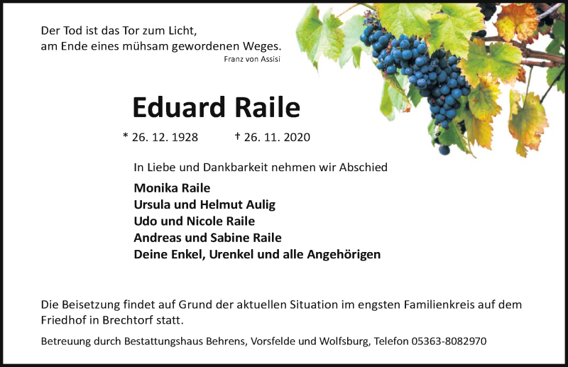 Hier finden Sie alle Traueranzeigen aus der Zeitung, die bisher für Eduard Raile erschienen sind. Weitere Traueranzeigen, die in der Zeitung erscheinen, werden hier ebenfalls aufgelistet