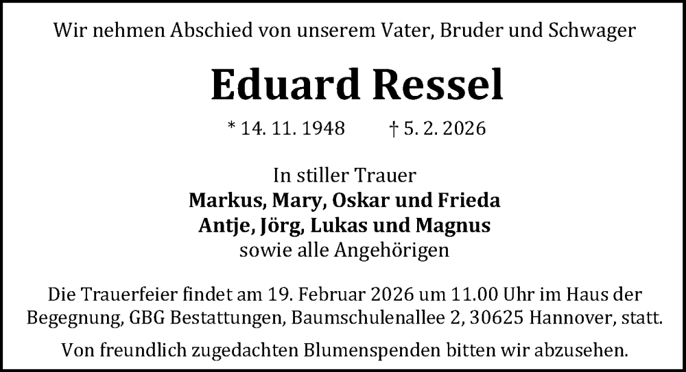 Hier finden Sie alle Traueranzeigen aus der Zeitung, die bisher für Eduard Ressel erschienen sind. Weitere Traueranzeigen, die in der Zeitung erscheinen, werden hier ebenfalls aufgelistet