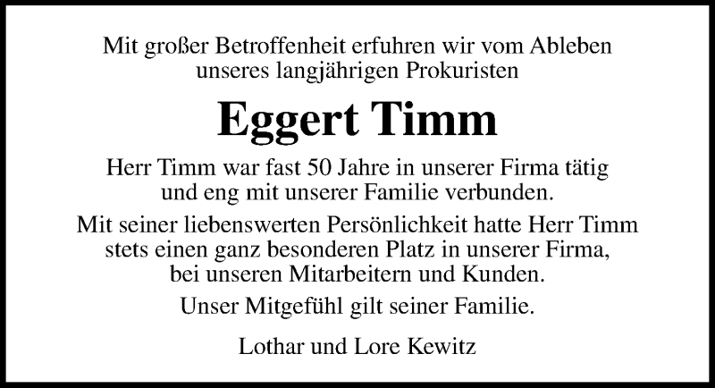 Hier finden Sie alle Traueranzeigen aus der Zeitung, die bisher für Eggert Timm erschienen sind. Weitere Traueranzeigen, die in der Zeitung erscheinen, werden hier ebenfalls aufgelistet