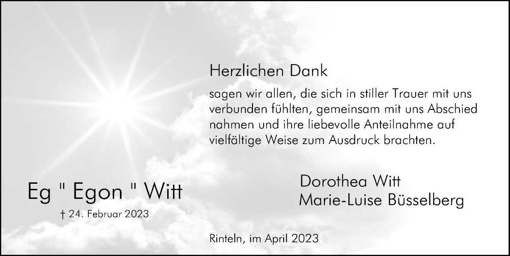 Hier finden Sie alle Traueranzeigen aus der Zeitung, die bisher für Egon Witt erschienen sind. Weitere Traueranzeigen, die in der Zeitung erscheinen, werden hier ebenfalls aufgelistet