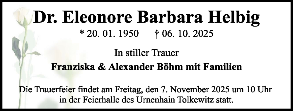 Hier finden Sie alle Traueranzeigen aus der Zeitung, die bisher für Eleonore Barbara Helbig erschienen sind. Weitere Traueranzeigen, die in der Zeitung erscheinen, werden hier ebenfalls aufgelistet