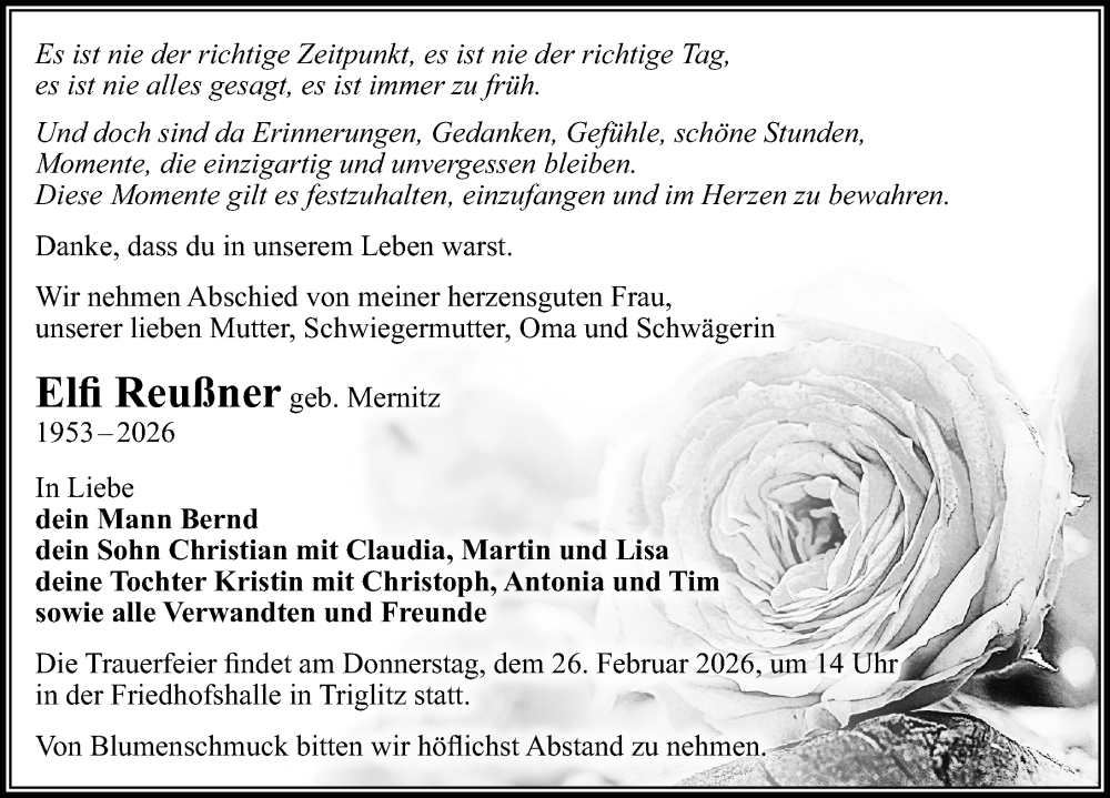 Hier finden Sie alle Traueranzeigen aus der Zeitung, die bisher für Elfi Reußner erschienen sind. Weitere Traueranzeigen, die in der Zeitung erscheinen, werden hier ebenfalls aufgelistet