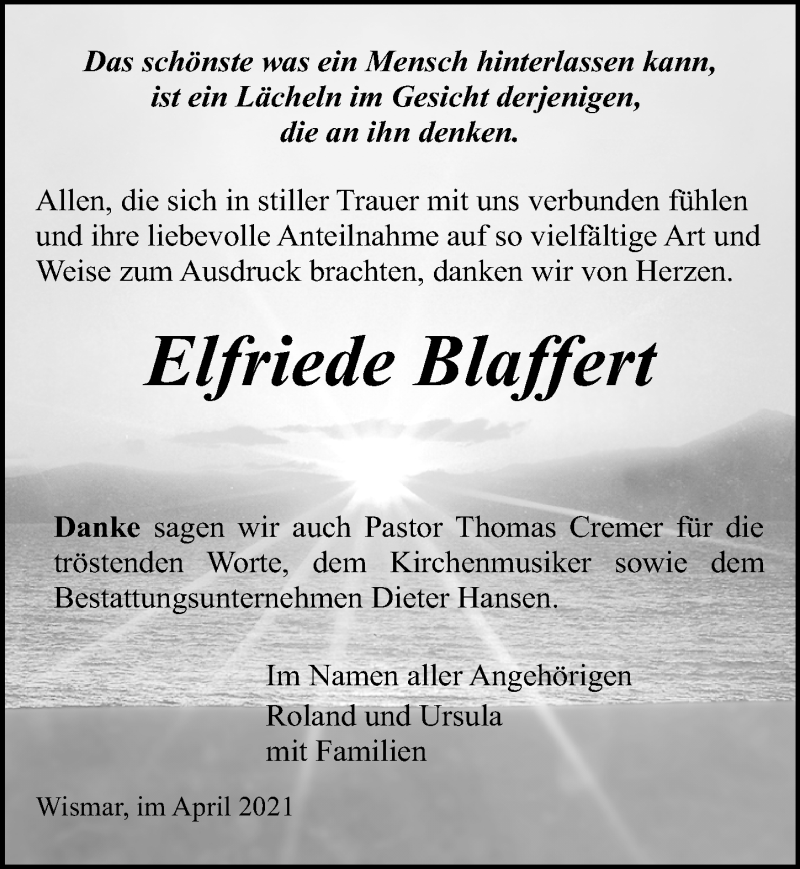 Hier finden Sie alle Traueranzeigen aus der Zeitung, die bisher für Elfriede Blaffert erschienen sind. Weitere Traueranzeigen, die in der Zeitung erscheinen, werden hier ebenfalls aufgelistet
