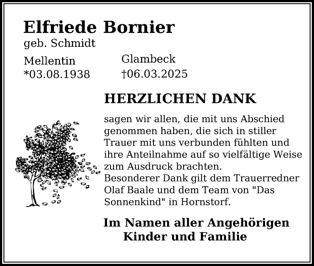Hier finden Sie alle Traueranzeigen aus der Zeitung, die bisher für Elfriede Bornier erschienen sind. Weitere Traueranzeigen, die in der Zeitung erscheinen, werden hier ebenfalls aufgelistet