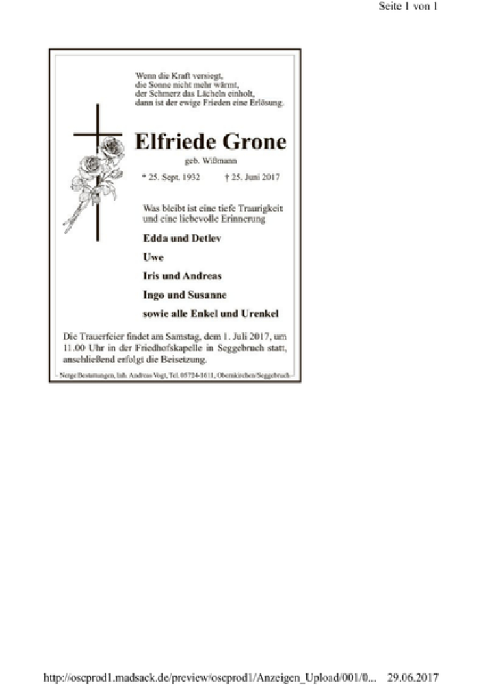Hier finden Sie alle Traueranzeigen aus der Zeitung, die bisher für Elfriede Grone erschienen sind. Weitere Traueranzeigen, die in der Zeitung erscheinen, werden hier ebenfalls aufgelistet