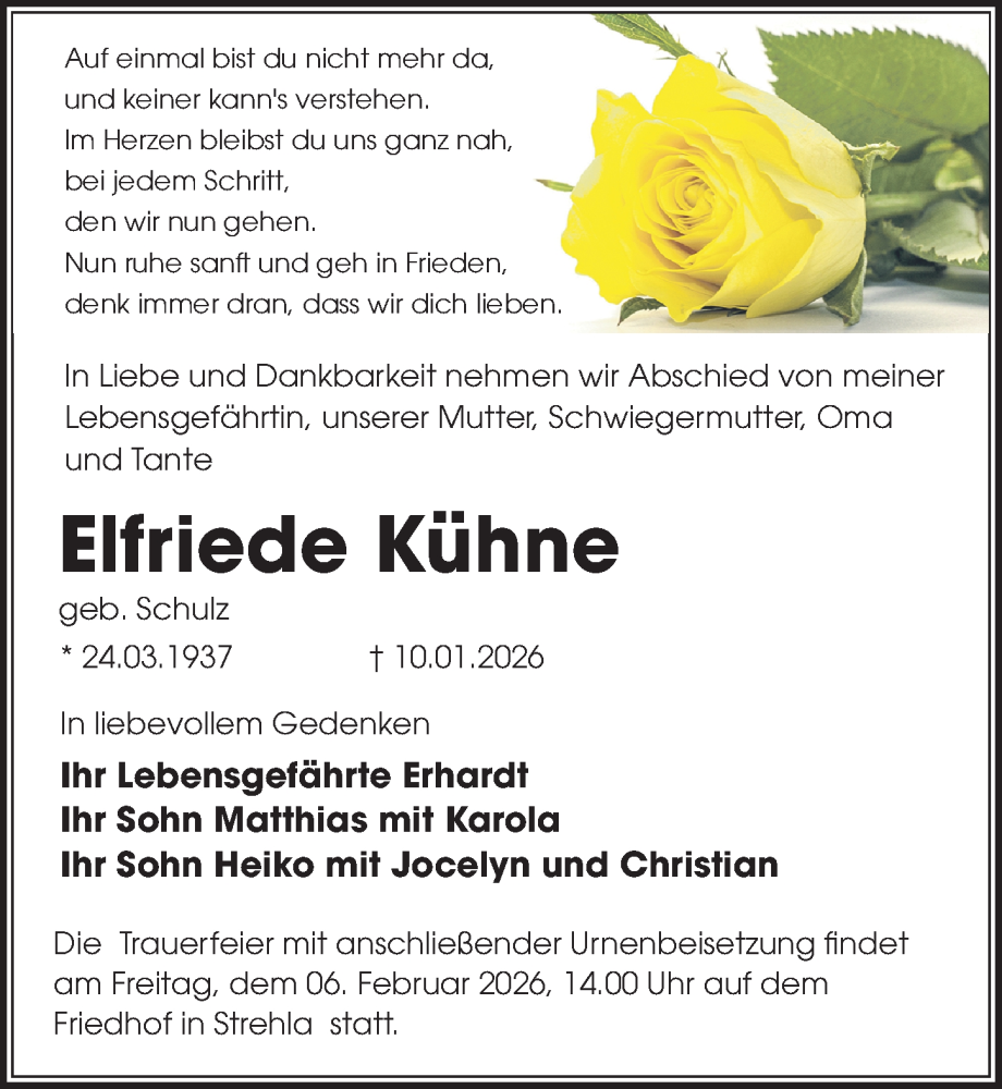 Hier finden Sie alle Traueranzeigen aus der Zeitung, die bisher für Elfriede Kühne erschienen sind. Weitere Traueranzeigen, die in der Zeitung erscheinen, werden hier ebenfalls aufgelistet