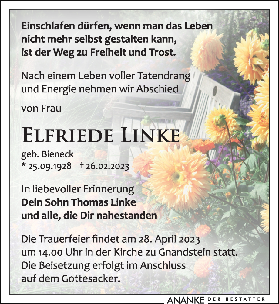 Hier finden Sie alle Traueranzeigen aus der Zeitung, die bisher für Elfriede Linke erschienen sind. Weitere Traueranzeigen, die in der Zeitung erscheinen, werden hier ebenfalls aufgelistet