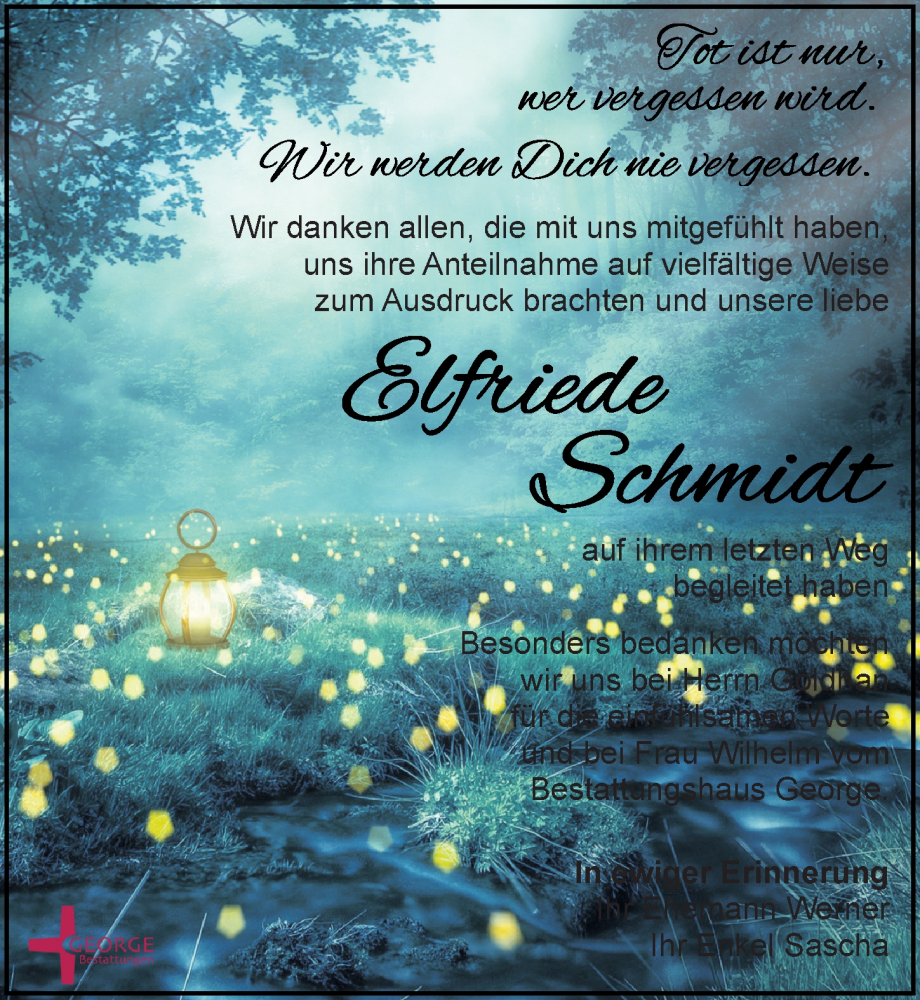 Hier finden Sie alle Traueranzeigen aus der Zeitung, die bisher für Elfriede Schmidt erschienen sind. Weitere Traueranzeigen, die in der Zeitung erscheinen, werden hier ebenfalls aufgelistet
