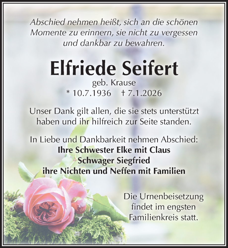 Hier finden Sie alle Traueranzeigen aus der Zeitung, die bisher für Elfriede Seifert erschienen sind. Weitere Traueranzeigen, die in der Zeitung erscheinen, werden hier ebenfalls aufgelistet