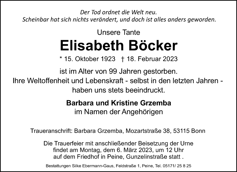 Hier finden Sie alle Traueranzeigen aus der Zeitung, die bisher für Elisabeth Böcker erschienen sind. Weitere Traueranzeigen, die in der Zeitung erscheinen, werden hier ebenfalls aufgelistet