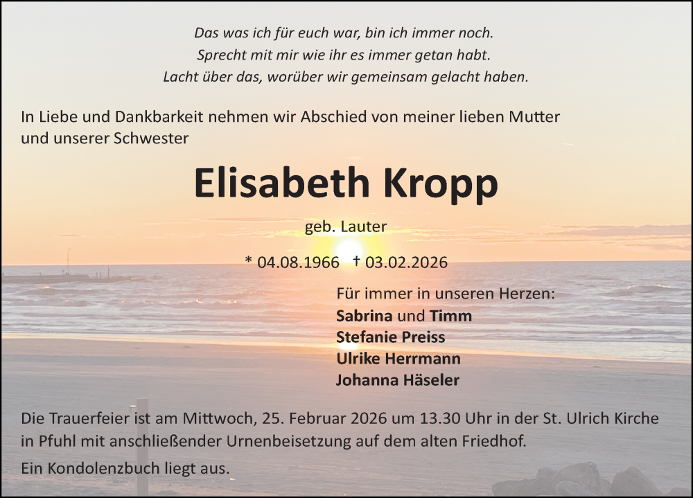 Hier finden Sie alle Traueranzeigen aus der Zeitung, die bisher für Elisabeth Kropp erschienen sind. Weitere Traueranzeigen, die in der Zeitung erscheinen, werden hier ebenfalls aufgelistet