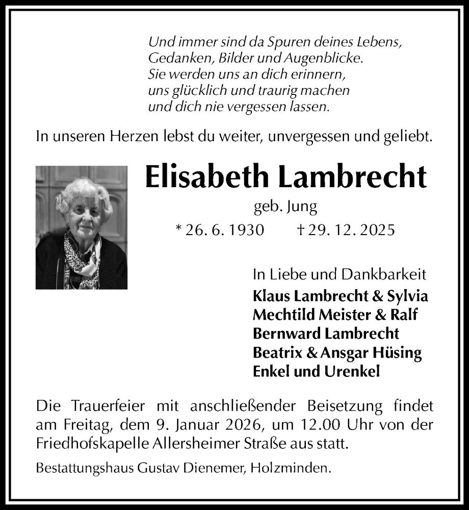 Hier finden Sie alle Traueranzeigen aus der Zeitung, die bisher für Elisabeth Lambrecht erschienen sind. Weitere Traueranzeigen, die in der Zeitung erscheinen, werden hier ebenfalls aufgelistet