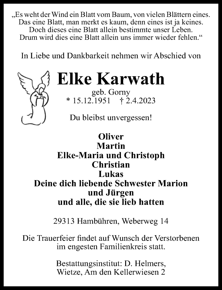 Hier finden Sie alle Traueranzeigen aus der Zeitung, die bisher für Elke Karwath erschienen sind. Weitere Traueranzeigen, die in der Zeitung erscheinen, werden hier ebenfalls aufgelistet